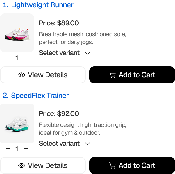 Turn every question into a sales opportunity. Suggest products based on customer intent, budget, or browsing history — all personalized and ready to add to cart.